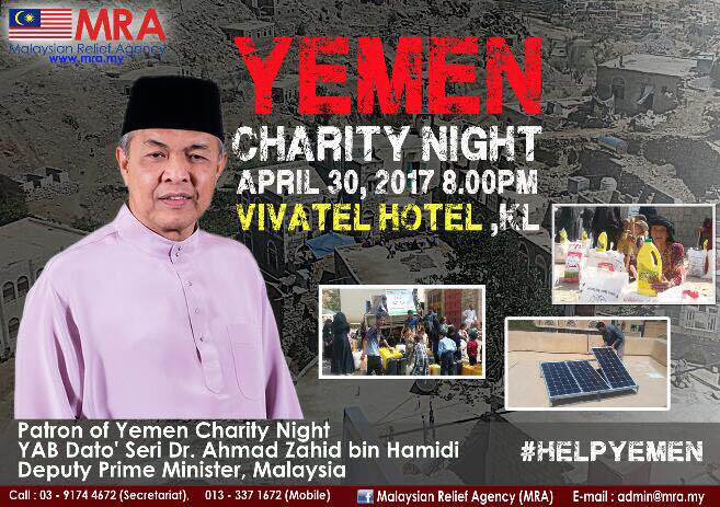 انطلاقا مع الدور الانساني الكبير الذي تقوم به مملكة ماليزيا تجاه المنكوبين من جراء الكوارث والحروب والنزاعات ووفق توجيهات قائد العمل الانساني نائب رئيس الوزراء وزير الداخلية احمد زاهيدي حميدي ، اطلقت وكالة الاغاثة الماليزي بالتعاون مع السفارة اليمنية الحملة الإغاثية للشعب اليمني الشقيق داعين كافة المتبرعين وأهل الخير من الأفراد والمؤسسات الى نجدة إخوانهم المشردين واللاجئين من الأشقاء اليمنيين ضحايا الأحداث الجارية والتي ستبدأ في الساعة 8 ليلا .